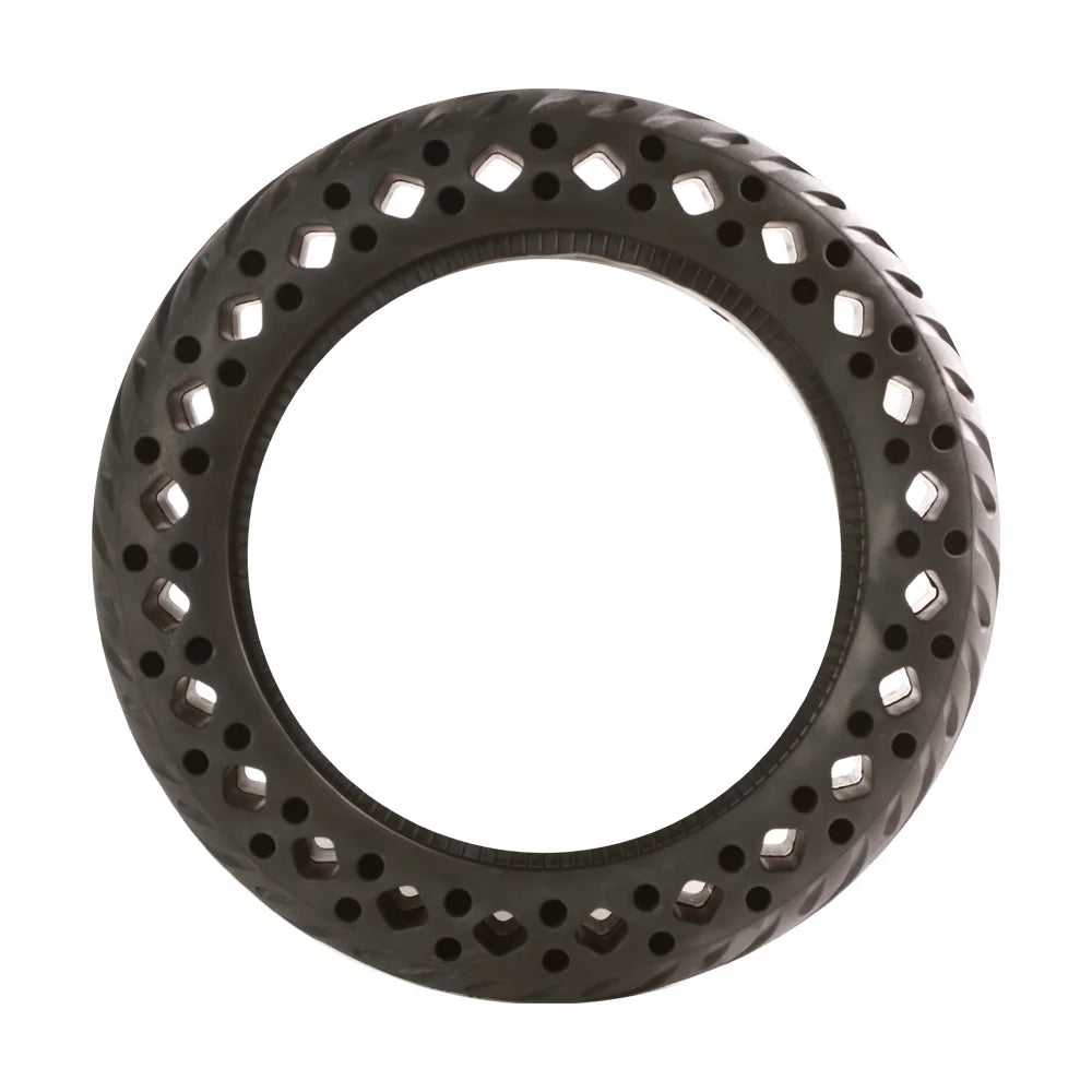 This solid rubber tire will never go flat! Cross-molded perforations provide a pliant cushioning effect to enhance surface grip and prevent your teeth from rattling.